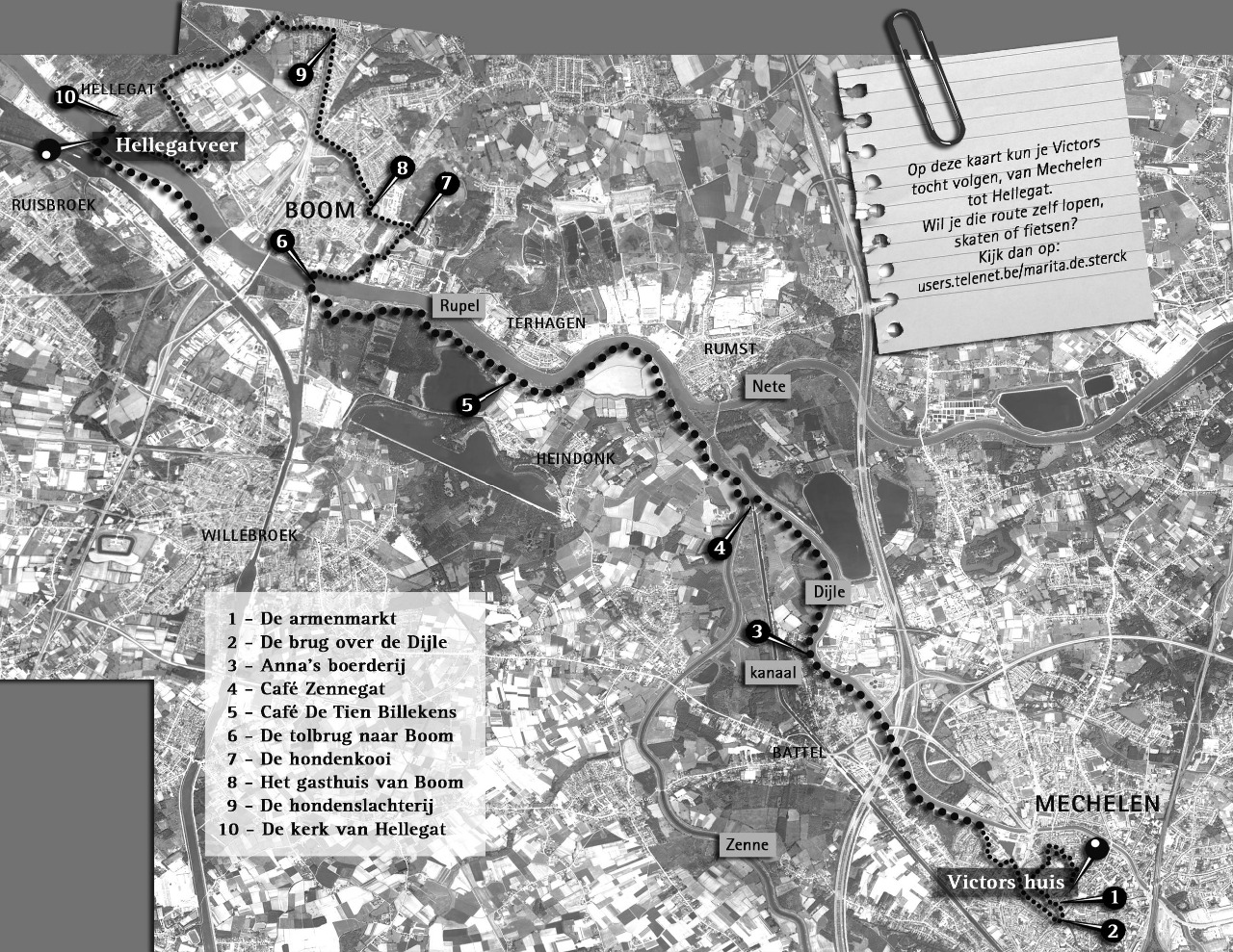 Het verhaal speelt zich af tijdens de eerste wereloorlog tussen Mechelen en Boom. Victor woont in Mechelen aan de Sint-Rombautskathedraal, in een rijke buurt. Gedurende het verhaal reist hij te voet door de arme Rupelstreek om zijn hond te zoeken.